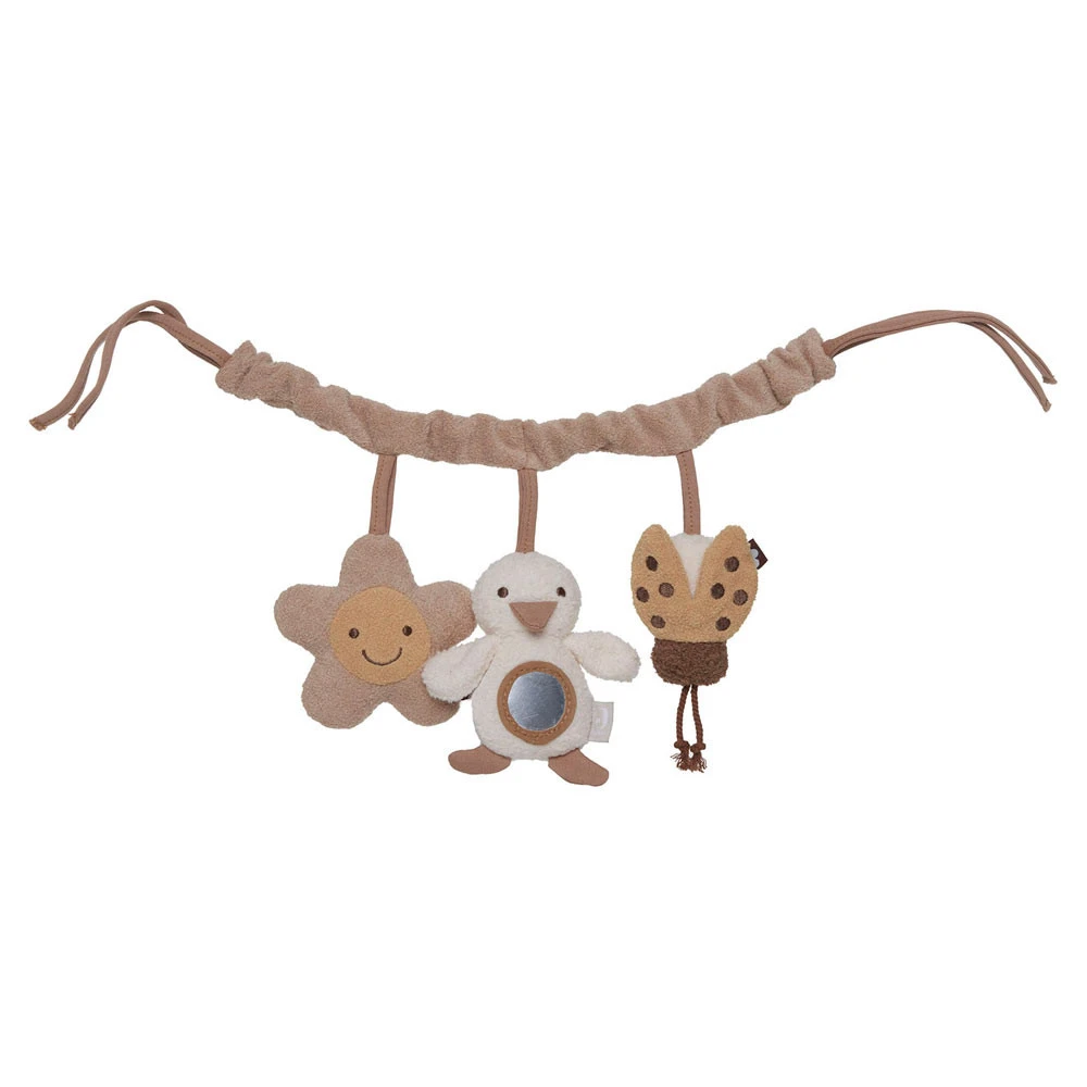 Dit is een schattige en kleurrijke wagenspanner die perfect is om je baby te vermaken. De ketting heeft drie zachte speeltjes: een bloem, een eend en een lieveheersbeestje. Alle speeltjes hebben een knisperend element dat je baby bezig zal houden.