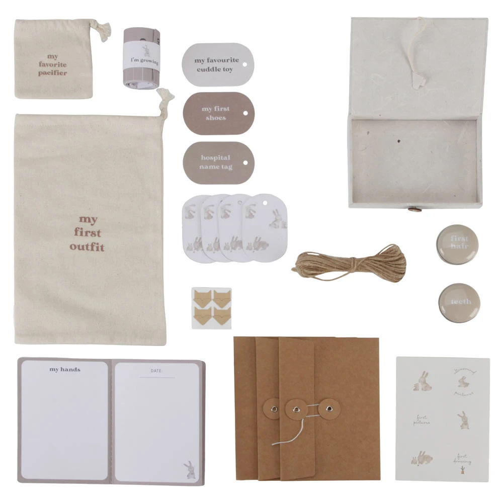 - Opbergdoos met opbergzakken, meetlint, opbergdozen, enveloppen, labels, een boekje en touw.