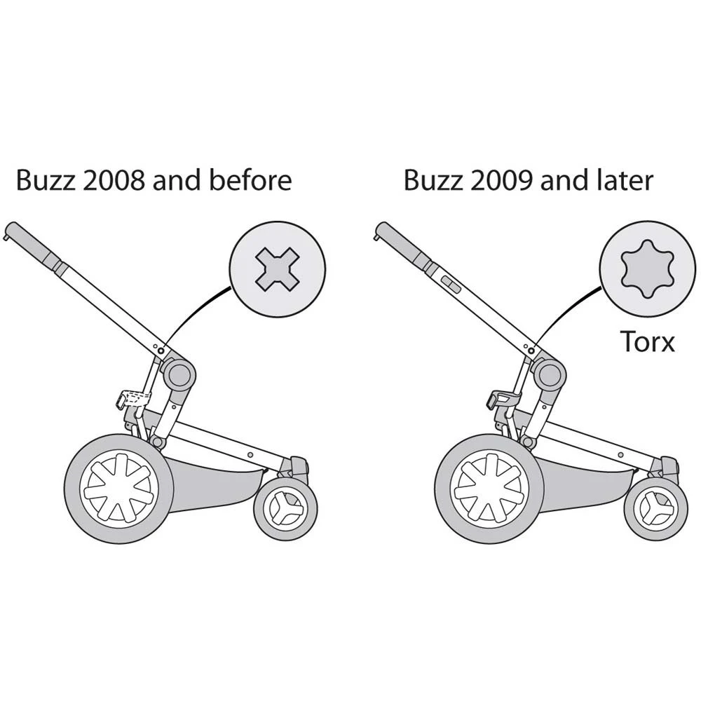 - Weet je niet zeker of je een Buzz uit 2009 of later hebt? Kijk dan naar de extra productafbeelding. Als jouw Quinny Buzz torxschroeven heeft, dan gaat het om een frame uit 2009 of later.